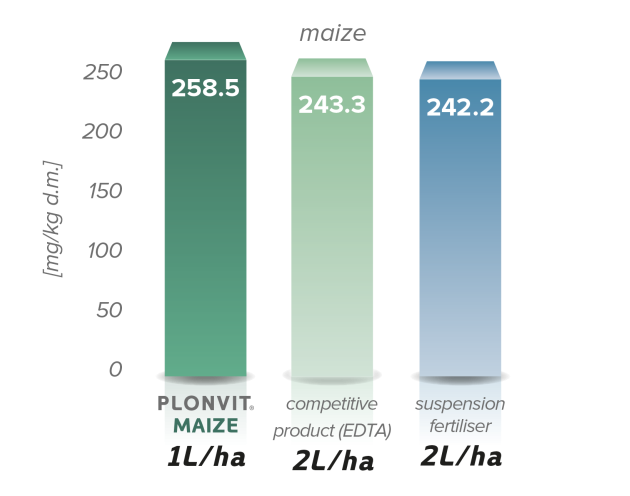 El efecto de PLONVIT® MAÍZ fertilizantes sobre el contenido de nutrientes (Cu, Fe, Mn, Zn) en las hojas.